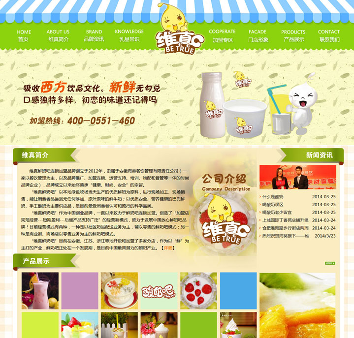 維真鮮奶吧網(wǎng)站在經(jīng)過合肥網(wǎng)絡公司技術人員的與??W(wǎng)站運營負責人的共同努力下,于2014年3月25日正式投入使用。維真鮮奶吧的網(wǎng)站主要為產(chǎn)品宣傳和招商加盟性質,網(wǎng)站頁面簡潔明快,以草綠色和淡黃色為主要色調。其中維真的產(chǎn)品和店面形象以及加盟支持等使用拼盤形式,顯得輕松活潑,符合鮮奶吧的輕松時尚的旋律。