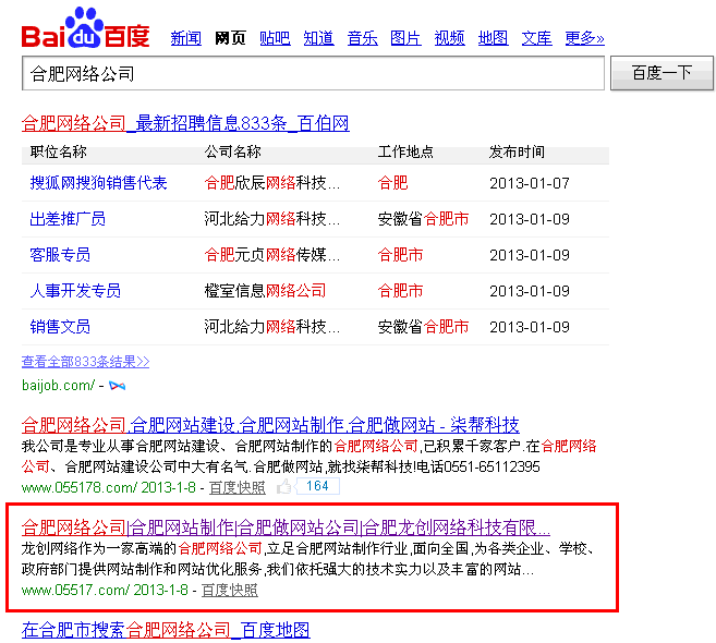 經過我公司技術人員的一致努力,目前,百度搜索“合肥網絡公司”一詞,我們的網站m.haosenweiye.com 已躍至百度排名第二位。以下是2013年1月8日的百度搜索截圖: